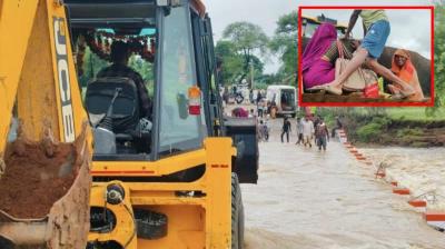 जेसीबी की बकेट से गर्भवती महिला ने पार किया बहता नाला, दूसरी ओर इंतज़ार कर रही थी एम्बुलेंस