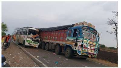 मतदान सामग्री जमा करवाकर लौट रही कर्मचारियों की बस ट्रक में घुसी, एक होमगार्ड जवान की मौत, 9 घायल
