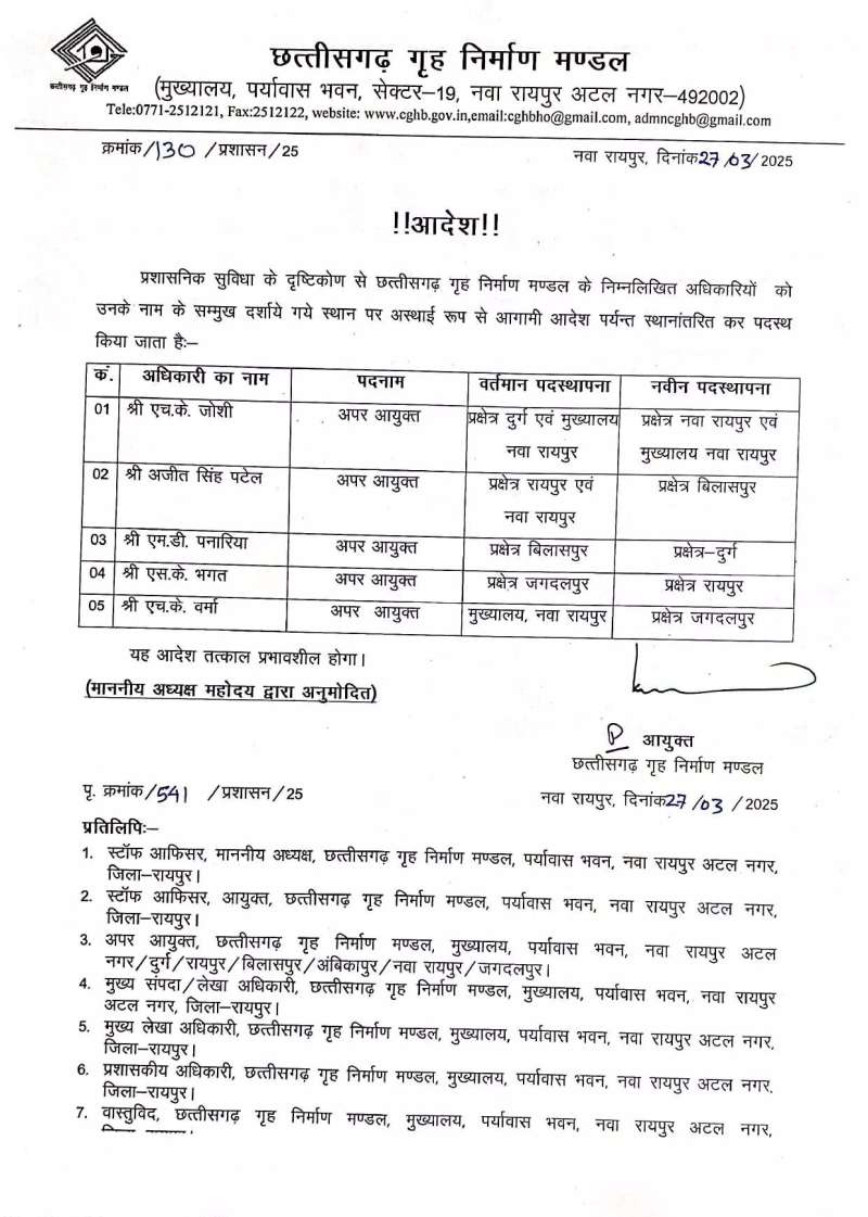 छत्तीसगढ़ गृह निर्माण मंडल के अधिकारियों का तबादला, लंबे समय से एक ही स्थान पर जमे थे