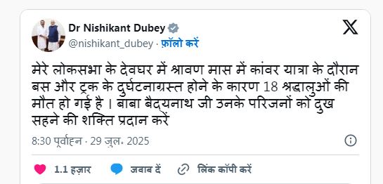 इस बीच सांसद निशिकांत दुबे ने ट्वीट किया है कि मेरे लोकसभा के देवघर में श्रावण मास में कांवर यात्रा के दौरान बस और ट्रक के दुर्घटनाग्रस्त होने के कारण 18 श्रद्धालुओं की मौत हो गई है। बाबा बैद्यनाथ जी उनके परिजनों को दुख सहने की शक्ति प्रदान करें।