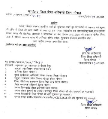 भोपाल में 30 जुलाई को स्कूल बंद, लगातार बारिश के कारण कलेक्टर ने आदेश जारी किए