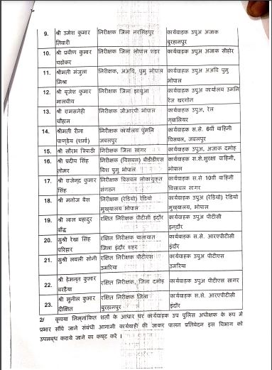 मध्य प्रदेश के गृह विभाग ने पुलिस इंस्पेक्टर्स से उप पुलिस अधीक्षक (कार्यवाहक) बनाये गए 23 पुलिस अधिकारियों की पदस्थापना के आदेश जारी किये हैं, इसमें निरीक्षक संवर्ग के 15 , रेडियो संवर्ग का 1, रक्षित नरीक्षक संवर्ग के पांच, एसएएफ संवर्ग के 2 अधिकारी शामिल हैं जिनका प्रमोशन उपरांत पदस्थापना आदेश जारी हुआ है।