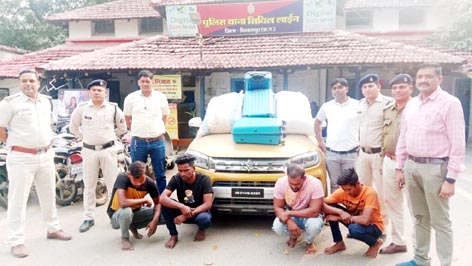 बिलासपुर । अवैध नशे के विरूद्व बिलासपुर पुलिस द्वारा अभियान चलाकर गांजा तस्करी कर रहे 04 आरोपीयों से 45 किलो गांजा जप्त कर एनडीपीएस एक्ट के अंतर्गत कार्यवाही किया गया है। आरोपीगण द्वारा गांजा तस्करी हेतु उपयोग किये जा रहे ब्रेजा कार को भी मामले में जप्त किया गया है। बरामद गांजे का बाजार मूल्य लगभग 4 लाख 50 हजार रूपये है।‘‘