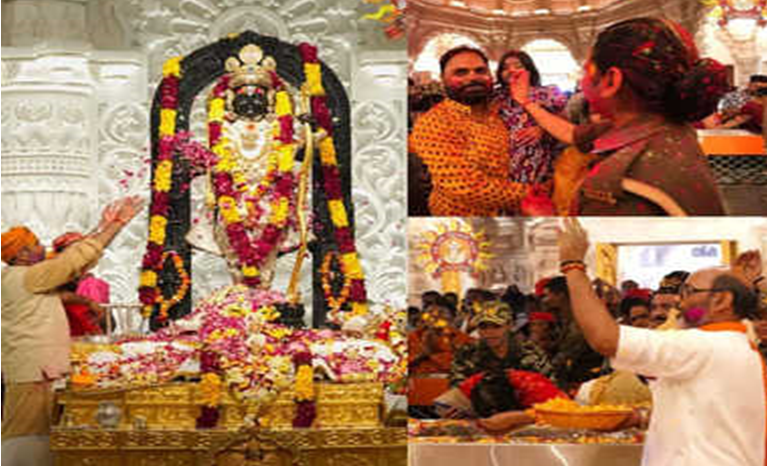 रामलला के दरबार में पुजारियों ने रामलला के ऊपर पुष्पों की वर्षा कर अपने आराध्य के साथ होली खेली। उनके राग भोग और श्रृंगार के क्रम में उन्हें अबीर गुलाल अर्पित किया गया। 56 प्रकार के व्यंजनों का भोग लगाया गया। पुजारी ने भी रामलला को होली के गीत सुनाए। वहीं राम जन्म भूमि परिसर में रामलला के दर्शन को पहुंचे श्रद्धालु भी होली के गीतों पर नाचते, झूमते, गाते नजर आए । इसी तरह पूरी रामनगरी में होली का उल्लास छाया रहा।